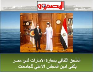 التقى الشيخ الدكتور عمار بن ناصر المعلا الملحق الثقافي لدولة الامارات العربية المتحدة بالقاهرة الدكتور محمد لطيف امين عام المجلس الاعلي للجامعات بحضور السيد راشد عبدالله الزوي رئيس القسم السياسي بالسفارة في مقر المجلس .