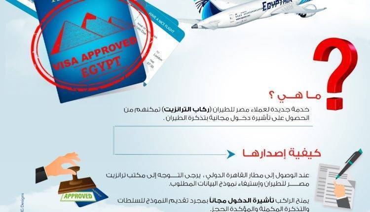 وفى إطار توجيهات الفريق محمد عباس حلمى وزير الطيران المدنى نحو توفير كافة أوجه الدعم والتسهيلات لزائري مصر، وذلك بما يعود بالنفع لصالح قطاعى الطيران والسياحة وعلي الدولة المصرية ، أعلنت مصر للطيران_الناقل الوطني عن إمكانية الحصول علي تأشيرة ترانزيت مجانية للدخول إلى جمهورية مصر العربية مدتها تبدأ من 8 ساعات إلى 96 ساعة ويمكن الحصول عليها عند الوصول إلى مطار القاهرة الدولى، على أن يتوجه الراكب إلى مكتب ترانزيت مصر للطيران بمطار القاهرة لاستيفاء استمارة البيانات التى بموجبها يتم الحصول على تأشيرة الوصول مجانًا بدون تحصيل أى رسوم مقابل تلك الخدمة.