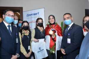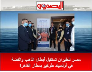 استقبلت مصرللطيران اليوم بمطار القاهرة البطلة فريال أشرف الحاصلة على الميدالية الذهبية في منافسات الكاراتيه والبطل أحمد الجندي الحاصل على الميدالية الفضية في منافسات الخماسي الحديث في دورة الألعاب الأوليمبية طوكيو ٢٠٢٠ ، حيث قام فريق عمل العلاقات العامة بمصر للطيران باستقبال أبطال مصر وتهنئتهم بالإنجاز الكبير الذي حققوه في أولمبياد طوكيو ورفع علم مصر عاليا ، وأعرب الطيار عمرو أبوالعينين عن سعادته بالابطال المصريين و اكد دعم ومساندة الشركة الوطنية مصر للطيران لجميع ابطال مصر الرياضيين في مختلف الألعاب الرياضية سواء في المشاركات والبطولات الدولية أو معسكرات التدريب . كما هنأ الطيار عمرو نبيل رئيس شركة مصر للطيران للخطوط الجوية الابطال المصريين و اثني علي جهودهم المشرفة و حصولهم علي ميداليات تضاف الي الانجازات المصرية في المجال الرياضي.