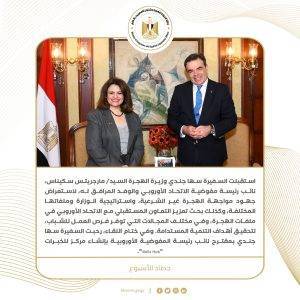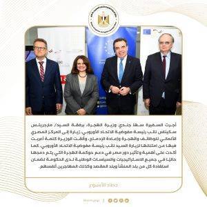 3) استقبلت السفيرة سها جندي وزيرة الهجرة السيد/ مارجريتس سكيناس، نائب رئيسة مفوضية الاتحاد الأوروبي والوفد المرافق له، وذلك لاستعراض جهود الدولة المصرية في مواجهة الهجرة غير الشرعية، واستراتيجية وزارة الهجرة وملفاتها المختلفة، وكذلك بحث تعزيز التعاون المستقبلي مع الاتحاد الأوروبي في ملفات الهجرة، وسبل انتقال العمالة المدربة وتوفير فرص للهجرة الآمنة والتعاون في مختلف الجوانب المتعلقة، ومن بينها دمج العمالة العائدة من الخارج والتعاون في مختلف المجالات التي توفر فرص العمل للشباب، لتحقيق أهداف التنمية المستدامة. وفي ختام اللقاء، رحبت السفيرة سها جندي بمقترح نائب رئيسة المفوضية الأوروبية بإنشاء مركز للخبرات “Skills Hub”، مشيرة لأهمية دراسة سبل البدء في عمل ذلك المركز، موضحة أن هناك الكثير من العمالة التي يمكن أن تمثل إضافة للمجتمعات بجانب الإسهام في التنمية الإنسانية التي نحرص عليها.