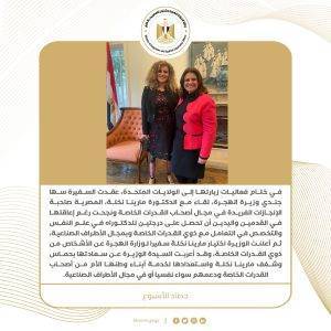 2) في ختام فعاليات زيارتها إلى الولايات المتحدة، عقدت السفيرة سها جندي وزيرة الهجرة، لقاء مع الدكتورة مارينا نخلة، المصرية صاحبة الإنجازات الفريدة في مجال أصحاب القدرات الخاصة ونجحت رغم إعاقتها في القدمين واليدين أن تحصل على درجتين للدكتوراه في علم النفس والتخصص في التعامل مع ذوي القدرات الخاصة وبمجال الأطراف الصناعية، ثم أعلنت الوزيرة اختيار مارينا نخلة سفيرا لوزارة الهجرة عن الأشخاص من ذوي القدرات الخاصة، وقد أعربت السيدة الوزيرة عن سعادتها بحماس وشغف مارينا نخلة واستعدادها لخدمة أبناء وطنها الأم من أصحاب القدرات الخاصة ودعمهم سواء نفسيا أو في مجال الأطراف الصناعية.