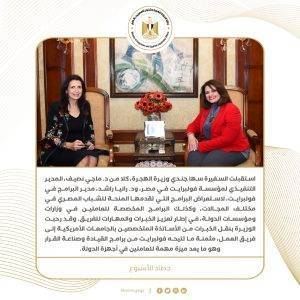 7) استقبلت السفيرة سها جندي وزيرة الهجرة، كلا من د. ماجي نصيف، المدير التنفيذي لمؤسسة فولبرايت في مصر، ود. رانيا راشد، مدير البرامج في فولبرايت، لاستعراض البرامج التي تقدمها المنحة للشباب المصري في مختلف المجالات، وكذلك البرامج المخصصة للعاملين في وزارات ومؤسسات الدولة، في إطار تعزيز الخبرات والمهارات للفريق. وقد رحبت الوزيرة بنقل الخبرات من الأساتذة المتخصصين بالجامعات الأمريكية إلى فريق العمل، مثمنة ما تتيحه فولبرايت من برامج القيادة وصناعة القرار وهو ما يعد ميزة مهمة للعاملين في أجهزة الدولة.
