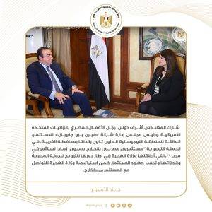 6) شارك المهندس أشرف دوس، رجل الأعمال المصري بالولايات المتحدة الأمريكية ورئيس مجلس إدارة شركة «فيرن برو جلوبال» للاستثمار، المالكة للمنطقة اللوجيستية الداون تاون بالدلتا بمحافظة الغربية، في الحملة التوعوية “مستثمرون مصريون بالخارج يجيبون: لماذا نستثمر في مصر؟”، التي أطلقتها وزارة الهجرة في إطار دورها للترويج للدولة المصرية وإنجازاتها وتحفيز جهود الاستثمار ضمن استراتيجية وزارة الهجرة للتواصل مع المستثمرين بالخارج. وقد رحبت السفيرة سها جندي وزيرة الهجرة بالمهندس أشرف دوس، مشيرة إلى أن الحملة تهدف إلى تسليط الضوء على ما يتميز به السوق المصري من عوامل جذب وفرص استثمارية واعدة في مختلف المجالات في ظل عملية التنمية التي تتم على أرض مصر وتوفير بنية تحتية على أعلى مستوى، واتخاذ إجراءات من شأنها التيسير على المستثمرين.