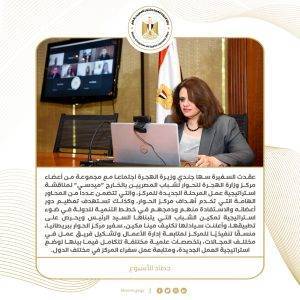 5) عقدت السفيرة سها جندي وزيرة الهجرة اجتماعا مع مجموعة من أعضاء مركز وزارة الهجرة للحوار لشباب المصريين بالخارج “ميدسي” لمناقشة استراتيجية عمل المرحلة الجديدة للمركز، والتي تتضمن عددا من المحاور الهامة التي تخدم أهداف مركز الحوار، وكذلك تستهدف تعظيم دور أعضائه والاستفادة منهم ودمجهم في خطط التنمية للدولة في ضوء استراتيجية تمكين الشباب التي يتبناها السيد الرئيس ويحرص على تطبيقها، وأعلنت سيادتها تكليف مينا مكين، سفير مركز الحوار ببريطانيا، منسقًا تنفيذيًا للمركز لمتابعة إدارة الأعمال وتشكيل فريق عمل في مختلف المجالات، بتخصصات علمية مختلفة تتكامل فيما بينها لوضع استراتيجية العمل الجديدة، ومتابعة عمل سفراء المركز في مختلف الدول. كما أدارت الوزيرة نقاشًا حول محاور استراتيجية المرحلة الجديدة لـ”ميدسي”، والتي تتميز بعدد من الملفات الهامة أبرزها هو البدء في تشكيل مجلس استشاري لشباب الباحثين المصريين بالخارج يضم كافة التخصصات العلمية، وتصبح مهمته الرئيسية هو تقديم أفكار وتوصيات وحلول علمية لكافة المجالات ذات الأولوية بالنسبة للدولة بالتعاون مع الوزارات والجهات المعنية بشكل تطوعي، يأتي ذلك بعد إشادة عدد من الوزراء بمشاركة وزارة الهجرة في مؤتمر قمة المناخ cop 27، وما قدموه شباب الباحثين المصريين بالخارج من أطروحات وأفكار خاصة بالاستدامة والبيئة.