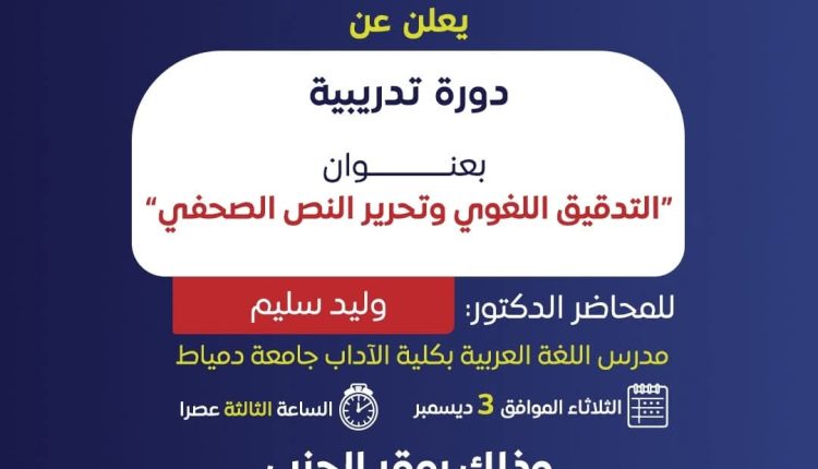 الدورة ستكون للمحاضر، الدكتور وليد سليم، مدرس اللغة العربية بكلية الآداب في جامعة دمياط، وذلك بإشراف المحاسب علي السيد كيوان، أمين الحزب بالمحافظة، والدكتور محمد العرابي، أمين التنظيم، والأستاذ محمد إبراهيم بربر، أمين أمانة الإعلام.