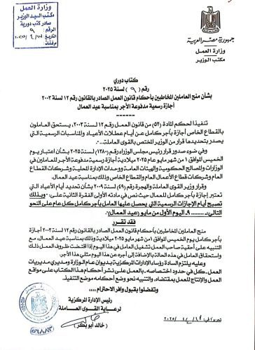 وأصدرت الوزارة ، كتابا دوريا بموجبه يلتزم رؤساء الإدارات المركزية بديوان الوزارة، ومديري مديريات العمل – كلٌ في حدود اختصاصه – بالعمل على نشر أحكام هذا الكتاب في مواقع العمل والإنتاج للعمل بمقتضاه، والتنبيه نحو وضع أحكامه موضع التنفيذ.