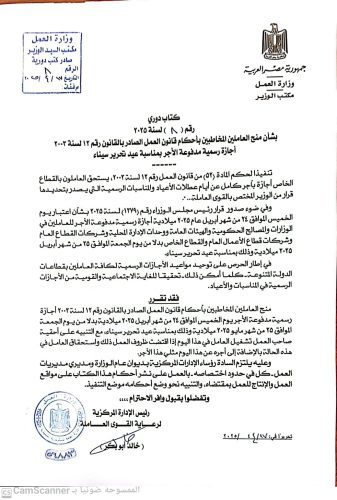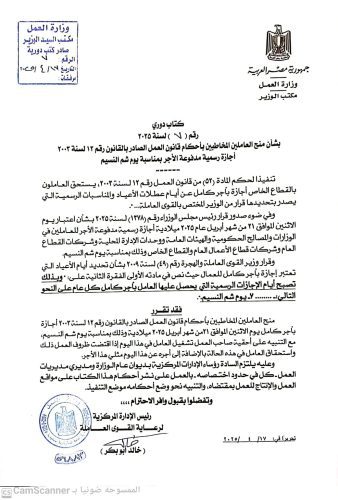 وأصدرت الوزارة كتابين دوريين رقم 7 و 8 لسنة 2025، بشأن منح العاملين المخاطبين بأحكام قانون العمل الصادر بالقانون رقم 12 لسنة 2003 ،إجازة رسمية مدفوعة الأجر بمناسبة عيد شم النسيم، وعيد تحرير سيناء ، وعليه يلتزم رؤساء الإدارات المركزية بديوان الوزارة، ومديري مديريات العمل – كلٌ في حدود اختصاصه – بالعمل على نشر أحكام هذا الكتاب في مواقع العمل والإنتاج للعمل بمقتضاه، والتنبيه نحو وضع أحكامه موضع التنفيذ.