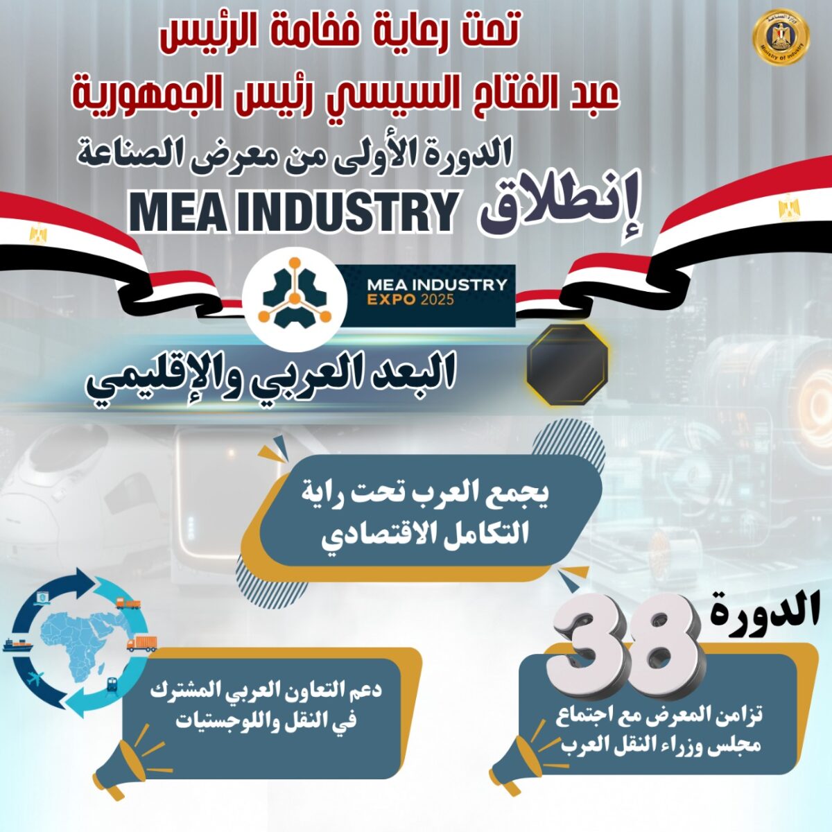 1. تحت رعاية فخامة الرئيس عبد الفتاح السيسي رئيس الجمهورية تنطلق غداً الأحد الموافق 9 نوفمبر فعاليات معرض ومؤتمر الصناعة والنقل معاً لتحقيق التنمية المستدامة (الدورة الأولى من معرض الصناعة MEA Industry بالتزامن مع الدورة السادسة من معرض ومؤتمر النقل الذكي واللوجستيات TransMEA) وتستمر فعاليات المعرض حتى 11 نوفمبر الجاري.