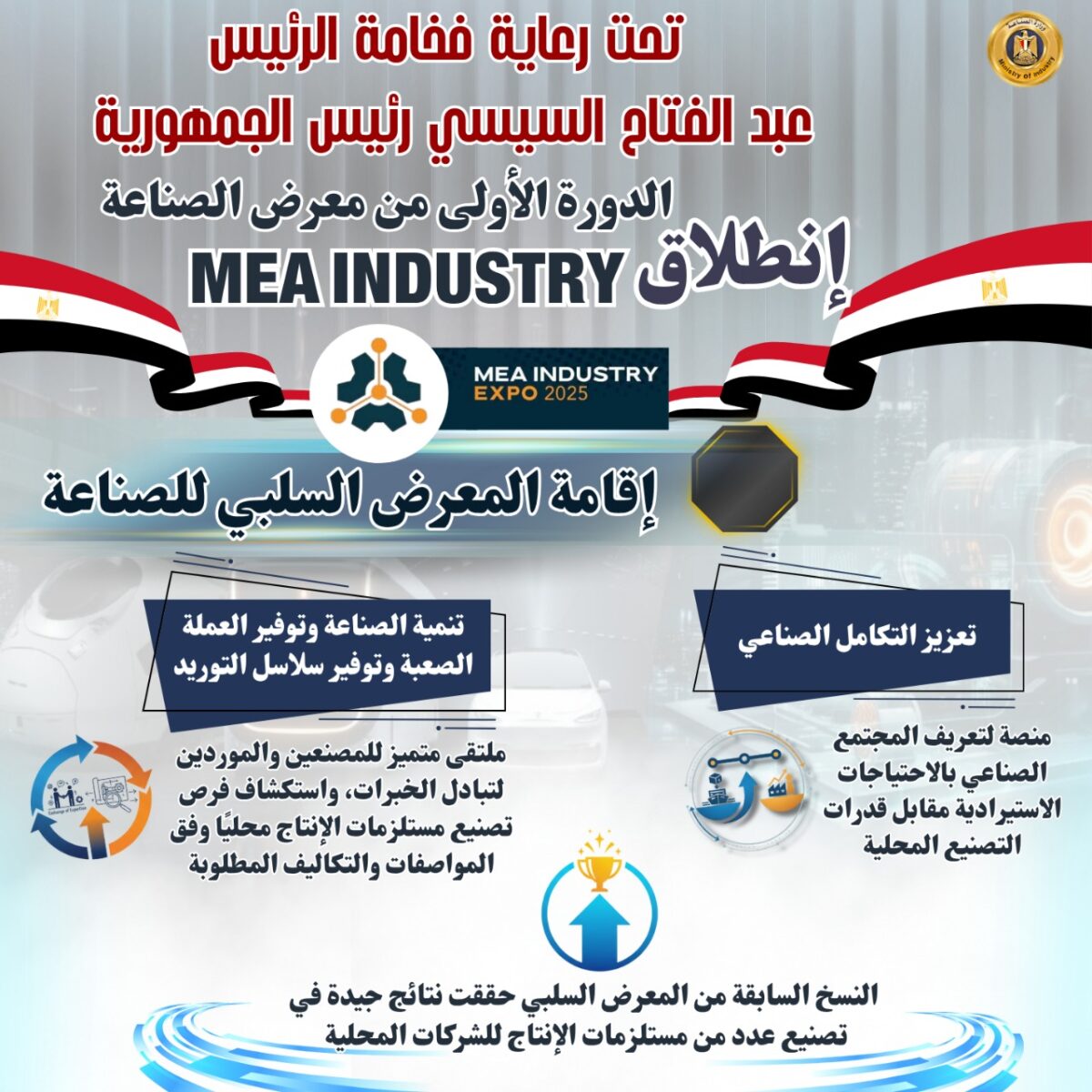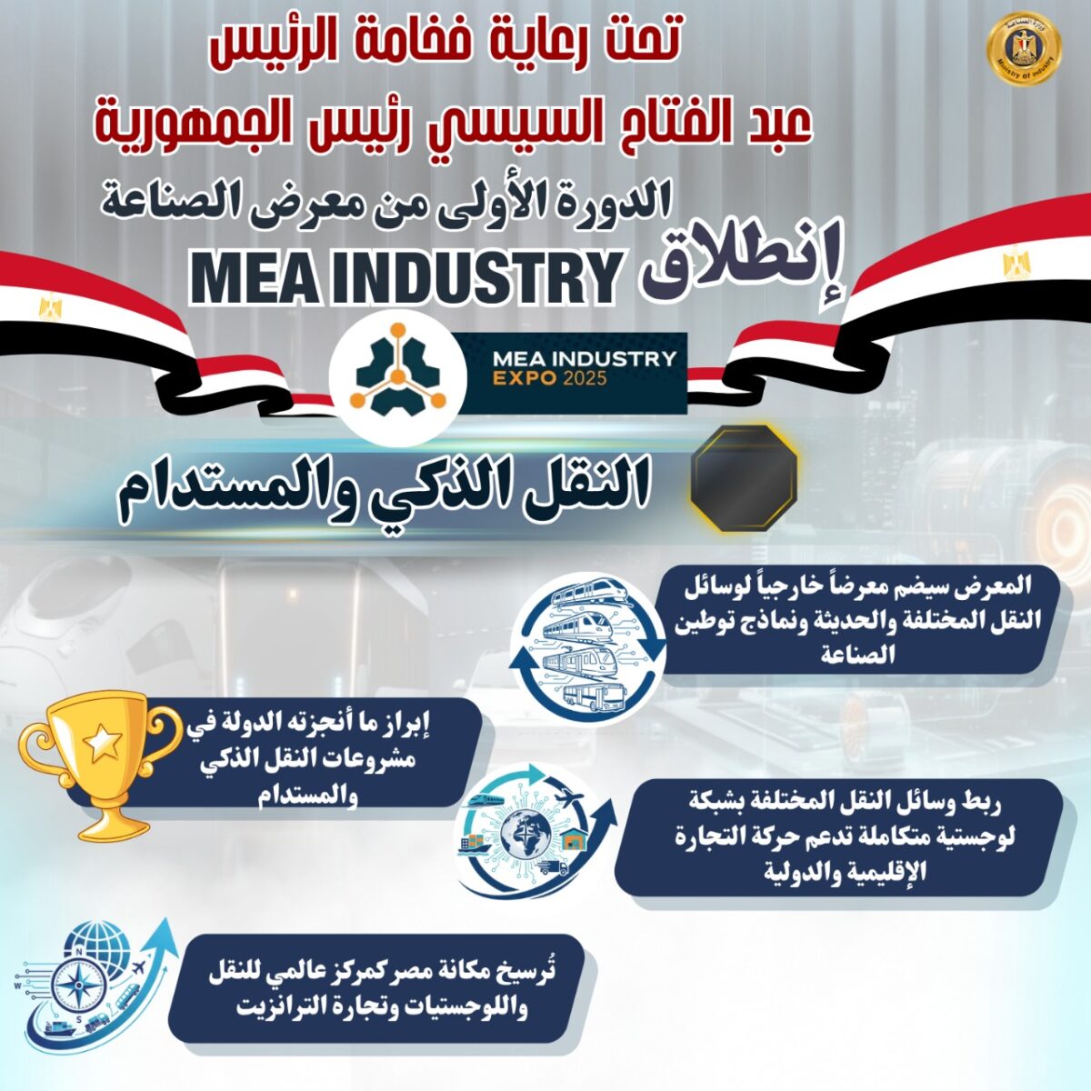 1. تحت رعاية فخامة الرئيس عبد الفتاح السيسي رئيس الجمهورية تنطلق غداً الأحد الموافق 9 نوفمبر فعاليات معرض ومؤتمر الصناعة والنقل معاً لتحقيق التنمية المستدامة (الدورة الأولى من معرض الصناعة MEA Industry بالتزامن مع الدورة السادسة من معرض ومؤتمر النقل الذكي واللوجستيات TransMEA) وتستمر فعاليات المعرض حتى 11 نوفمبر الجاري.