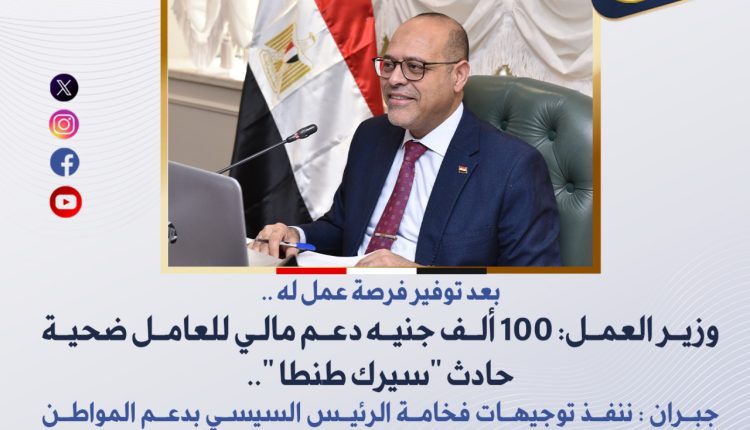 بتوجيه من محمد جبران وزير العمل ، استلم المواطن محمد إبراهيم عبد الفتاح ، مساعد مدربة السيرك، الذي تعرض لهجوم نمر مفترس أثناء العرض بمدينة طنطا، ما أدى إلى بتر ذراعه، شيك بقيمة 100 ألف جنيه من صندوق الخدمات الاجتماعية والصحية والثقافية التابع للوزارة ،وذلك كدعم مالي للعامل ضحية “حادث السيرك” . وأكد الوزير أن هذا الدعم يأتي بعد التنسيق مع محافظ الغربية اللواء أشرف الجندي ، الذي أسفر أيضا عن توفير فرصة عمل له بإحدى شركات الأدوية بالمحافظة .