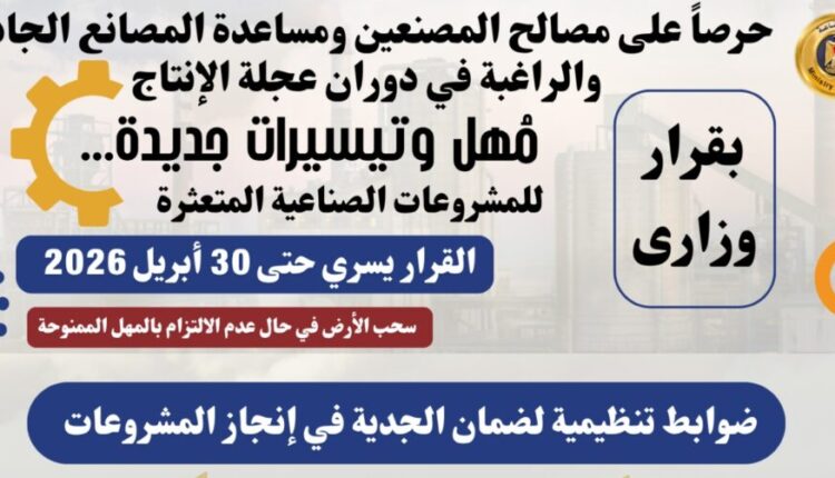 وتسري هذه المهل والتيسيرات التي ستنفذها الوزارة ممثلة في الهيئة العامة للتنمية الصناعية حتى 30 أبريل 2026 وتشمل: