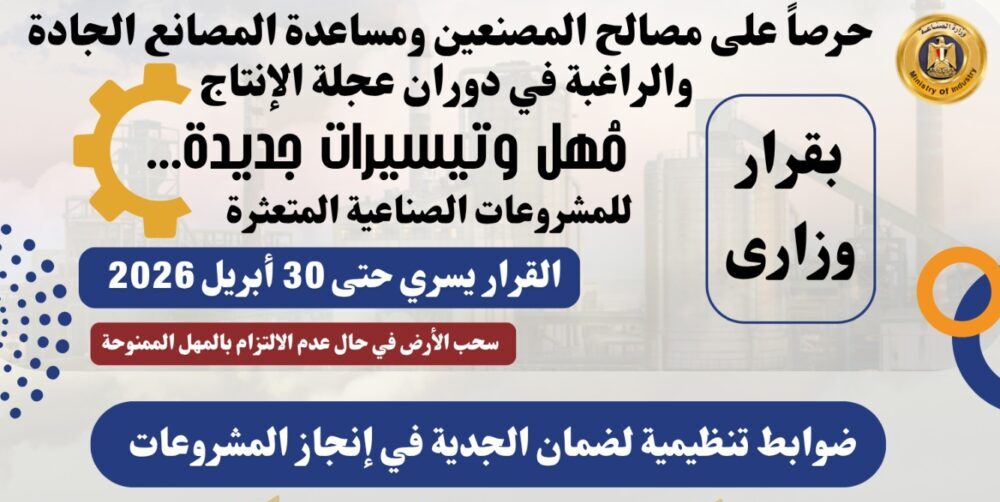 وتسري هذه المهل والتيسيرات التي ستنفذها الوزارة ممثلة في الهيئة العامة للتنمية الصناعية حتى 30 أبريل 2026 وتشمل: