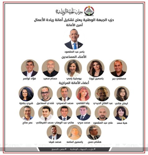 وجاء تشكيل أمانة ريادة الأعمال بحزب الجبهة الوطنية علي النحو التالي، الامناء المساعدون : مصطفى جبر، وياسمين ثروت، ويوستينا رامي، وحسام سعيد، وفؤاد لوكس، كما ضمت أعضاء الأمانة المركزية، رشا القاضي وإيمان هاني، وعبد الفتاح الديدي، ، ومحمد الأنصاري، وشادي إسماعيل، وشيري بشارة، وهاني عبد الوهاب، ومحمد الغيطاني، ومحمد سري، ومحمد عبد المقصود، وهبة سعد، وعمر صالح، وياسمين أسامه، ومحمد ضيف، ومحمد كرم، وهشام حسن.