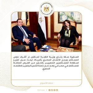 8) السفيرة سها جندي وزيرة الهجرة تستقبل المهندس أشرف دوس، رجل الأعمال المصري بالولايات المتحدة الأمريكية وأحد أهم رواد مؤتمر «مصر تستطيع بالاستثمار والتنمية»، لبحث سبل التعاون المشترك بصدد إسهامات المصريين بالخارج في دعم خطة التنمية وتعزيز الاقتصاد المصري. وجاء اللقاء في إطار الدور الذي تقوم به الوزارة في تعزيز التواصل مع المستثمرين المصريين في الخارج من أجل تسهيل عملهم وتذليل أي عقبات قد تواجههم.