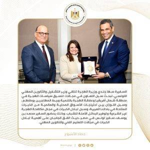 7) السفيرة سها جندي وزيرة الهجرة تلتقي وزير التشغيل والتكوين المهني التونسي، لبحث سبل التعاون في مجالات تنسيق سياسات الهجرة في منطقة شمال أفريقيا وعلاقة الهجرة بالتنمية وربط المهاجرين بوطنهم، وسبل التوزان بين احتياجات الأسواق المحلية والعالمية من الخبرات المتاحة في بلداننا العربية، وسبل تبادل الخبرات في مجال مكافحة الهجرة غير الشرعية وتوفير البدائل الآمنة للشباب، وذلك بحضور السفير محمد بن يوسف، سفير تونس في مصر، حيث اتفق الجانبان على أهمية تبادل الخبرات في مجالات التعليم الفني والتكوين المهني، لسدّ احتياجات سوق العمل وتوفير فرص أكبر للهجرة الآمنة، وتنسيق الجهود لعقد ورش عمل على مستوى الخبراء في قضايا الهجرة، لتحقيق الاستفادة المتبادلة بين الخبراء بالخارج من مصر وتونس وأوطانهم.