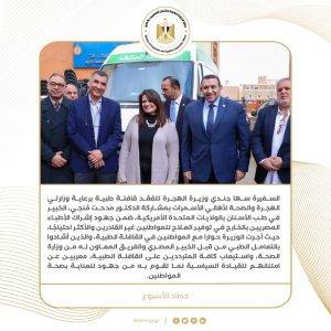 5) السفيرة سها جندي وزيرة الهجرة تتفقد قافلة طبية برعاية وزارتي الهجرة والصحة لأهالي الأسمرات بمشاركة الدكتور مدحت مُنجي، الخبير في طب الأسنان بالولايات المتحدة الأمريكية، ضمن جهود إشراك الأطباء المصريين بالخارج في توفير العلاج للمواطنين غير القادرين والأكثر احتياجًا، حيث أجرت الوزيرة حوارا مع المواطنين في القافلة الطبية، والذين أشادوا بالتعامل الطبي من قبل الخبير المصري والفريق المعاون له من وزارة الصحة، واستيعاب كافة المترددين على القافلة الطبية، معربين عن امتنانهم للقيادة السياسية لما تقوم به من جهود للعناية بصحة المواطنين.