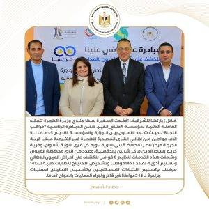 ) خلال زيارتها للشرقية.. افقدت السفيرة سها جندي وزيرة الهجرة تتفقد القافلة الطبية لمؤسسة #صناع_الخير، ضمن المبادرة الرئاسية “مراكب النجاة”، حيث شهد التعاون بين الوزارة والمؤسسة تقديم خدمات لـ 5 آلاف مواطن من أهالي القرى المصدرة للهجرة غير الشرعية منها قرية الحرجة مركز ناصر بمحافظة بني سويف، وبعض قرى النوبة بأسوان، وقرية كريم بساط الدين مركز شربين بالدقهلية، وعدد من قرى محافظة الفيوم، وشملت هذه الخدمات تنظيم 6 قوافل للكشف على أمراض العيون للأهالي وتسليم أدوية لعدد 1453مواطنا وتشخيص الاحتياج لنظارات طبية لـ1412 مواطنا وتسليم النظارات للمستفيدين وتشخيص الاحتياج لعمليات جراحية لـ 246مواطنا غير قادر واجراء العمليات بالمجان تماما.
