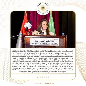 2) السفيرة سها جندي وزيرة الهجرة تلتقي أهالي محافظة الشرقية في لقاء جماهيري مفتوح للتوعية بمخاطر الهجرة غير الشرعية، حيث أوضحت أن الوزارة نفذت 55 دورة توعوية بمخاطر الهجرة غير الشرعية في 8 محافظات بإجمالي 1344 مستفيدا بالتوازي مع 60 دورة حرفية في 8 محافظات بإجمالي 1266 مستفيدا، بجانب توعية عدد 2700 شاب من مخاطر الهجرة غير الشرعية وتدريبهم وتأهيلهم حِرَفيا للانتقال لسوق العمل على المهن المختلفة ضمن فعاليات المبادرة الرئاسية حياة كريمة والمبادرة الرئاسية مراكب النجاة، من الشباب من الفئات العمرية من 16 إلى 45 سنة، على تخصصات متنوعة وهي (نجارة العمارة، والدهانات، والسباكة والكهرباء) وتم تنفيذ عدد 55 دورة توعوية بمخاطر الهجرة غير الشرعية في 8 محافظات بإجمالي 1344 مستفيدا، بالتوازي مع 60 دورة حرفية في 8 محافظات بإجمالي 1266 مستفيدا.
