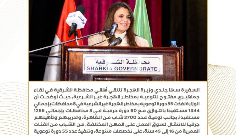 2) السفيرة سها جندي وزيرة الهجرة تلتقي أهالي محافظة الشرقية في لقاء جماهيري مفتوح للتوعية بمخاطر الهجرة غير الشرعية، حيث أوضحت أن الوزارة نفذت 55 دورة توعوية بمخاطر الهجرة غير الشرعية في 8 محافظات بإجمالي 1344 مستفيدا بالتوازي مع 60 دورة حرفية في 8 محافظات بإجمالي 1266 مستفيدا، بجانب توعية عدد 2700 شاب من مخاطر الهجرة غير الشرعية وتدريبهم وتأهيلهم حِرَفيا للانتقال لسوق العمل على المهن المختلفة ضمن فعاليات المبادرة الرئاسية حياة كريمة والمبادرة الرئاسية مراكب النجاة، من الشباب من الفئات العمرية من 16 إلى 45 سنة، على تخصصات متنوعة وهي (نجارة العمارة، والدهانات، والسباكة والكهرباء) وتم تنفيذ عدد 55 دورة توعوية بمخاطر الهجرة غير الشرعية في 8 محافظات بإجمالي 1344 مستفيدا، بالتوازي مع 60 دورة حرفية في 8 محافظات بإجمالي 1266 مستفيدا.