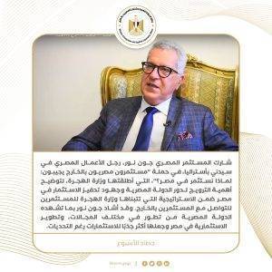 11) شارك المستثمر المصري جون نور، رجل الأعمال المصري في سيدني بأستراليا، في حملة “مستثمرون مصريون بالخارج يجيبون: لماذا نستثمر في مصر؟”، التي أطلقتها وزارة الهجرة، لتوضيح أهمية الترويج لدور الدولة المصرية وجهود تحفيز الاستثمار في مصر ضمن الاستراتيجية التي تتبناها وزارة الهجرة للمستثمرين للتواصل مع المستثمرين بالخارج. وقد أشاد جون نور بما تشهده الدولة المصرية من تطور في مختلف المجالات، وتطوير الاستثمارية في مصر وجعلها أكثر جذبًا للاستثمارات رغم التحديات، وأن هناك خطوات إيجابية تتحقق في مصر من سيولة مرورية وتعديلات تشريعية لدعم الاقتصاد، بجانب إتاحة مجالات جديدة مثل الاستثمار في الذهب الذي أعلنت عنه مصر مؤخرًا، وكذلك الاستثمار في العقارات، والاستفادة من مختلف الفرص المتاحة، بجانب العوائد المرتفعة على المبالغ المودعة في البنوك المصرية، والتي وصلت أحيانًا إلى نحو 19%.