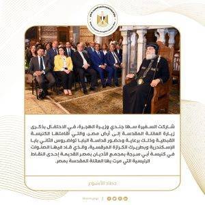 7) شاركت السفيرة سها جندي وزيرة الهجرة، في الاحتفال بذكرى زيارة العائلة المقدسة إلى أرض مصر، والتي أقامتها الكنيسة القبطية وذلك برعاية وحضور قداسة البابا تواضروس الثاني بابا الإسكندرية وبطريرك الكرازة المرقسية، والذي قاد فيها الصلوات في كنيسة أبي سرجة بمجمع الأديان بمصر القديمة إحدى النقاط الرئيسية التي مرت بها العائلة المقدسة بمصر. وقد ثمنت الوزيرة كلمة قداسة البابا تواضروس عن رحلة العائلة المقدسة إلى مصر ومسارها، وأكدت أن هناك اهتمامًا كبيرًا بالمسار من قبل الدولة، ليكون مشروعا سياحيا عالميًا روحانيا ودينيا يجذب ملايين السياح، لافتة إلى أنها تتفق مع ما قاله البابا تواضروس بضرورة أن يكون هناك توعية في مدارسنا ولدى طلابنا بأهمية هذا المسار وتابعت: “لابد أن نفتخر بأننا مصريين، إننا نقدم هدية للعالم في مجال السياحة الدينية وهو مسار العائلة المقدسة، حيث تنفرد مصر بهذا المسار الذي يضم 25 نقطة ما بين محطة ذهاب وعودة من محافظة سيناء حتى محافظة أسيوط”.