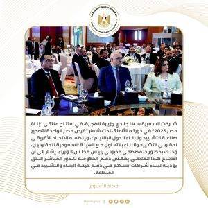 8) شاركت السفيرة سها جندي وزيرة الهجرة، في افتتاح ملتقى “بُناة مصر 2023” في دورته الثامنة، تحت شعار “فرص مصر الواعدة لتصدير صناعة التشييد والبناء لدول الإقليم”، وينظمه الاتحاد الأفريقي لمقاولي التشييد والبناء بالتعاون مع الهيئة السعودية للمقاولين، وذلك بحضور د. مصطفى مدبولي رئيس مجلس الوزراء. يشار إلى أن افتتاح هذا الملتقى يعكس دعم الحكومة للدور المباشر الذي يؤديه لبناء شراكات تسهم في دفع حركة البناء والتشييد في المنطقة، كحجر أساس لمواصلة جهود التنمية التي تشهدها العديد من البلدان، مع تعزيز مشاركة القطاع الخاص المصري ضمن هذه الجهود استناداً إلى خبراته الواسعة في هذا المجال.