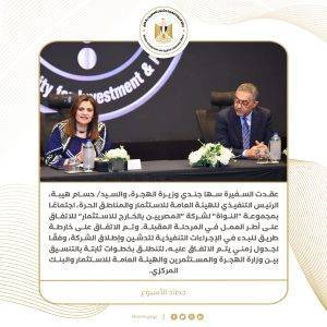6) عقدت السفيرة سها جندي وزيرة الهجرة، والسيد/ حسام هيبة، الرئيس التنفيذي للهيئة العامة للاستثمار والمناطق الحرة، اجتماعًا بمجموعة “النواة” لشركة “المصريين بالخارج للاستثمار” للاتفاق على أطر العمل في المرحلة المقبلة. وفي نهاية الاجتماع، تم الاتفاق على خارطة طريق للبدء في الإجراءات التنفيذية لتدشين وإطلاق الشركة، وفقًا لجدول زمني يتم الاتفاق عليه، لتنطلق بخطوات ثابتة بالتنسيق بين وزارة الهجرة والمستثمرين والهيئة العامة للاستثمار والبنك المركزي، كما أعربت السفيرة سها جندي عن شكرها للسيد الرئيس التنفيذي للهيئة العامة للاستثمار والمناطق الحرة، لما يقدمه من دعم كامل لهذه الشركة التي ولدت عملاقة وتضم نخبة من رموز المستثمرين ورجال الأعمال المصريين بالخارج.