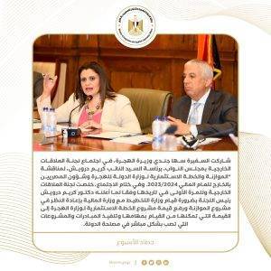 5) شاركت السفيرة سها جندي وزيرة الهجرة، في اجتماع لجنة العلاقات الخارجية بمجلس النواب، برئاسة السيد النائب كريم درويش، لمناقشة “الموازنة والخطة الاستثمارية لوزارة الدولة للهجرة وشؤون المصريين بالخارج للعام المالي 2023/2024. وفي ختام الاجتماع، خلصت لجنة العلاقات الخارجية وللمرة الأولى في تاريخها وفقا لما أعلنه دكتور كريم درويش رئيس اللجنة بضرورة قيام وزارة التخطيط مع وزارة المالية بإعادة النظر في مشروع الموازنة ورفع قيمة مشروع الخطة الاستثمارية لوزارة الهجرة إلى القيمة التي تمكنها من القيام بمهامها وتنفيذ المبادرات والمشروعات التي تصب بشكل مباشر في مصلحة الدولة.