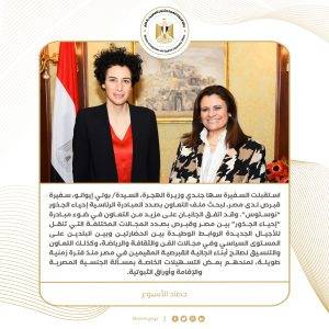4) استقبلت السفيرة سها جندي وزيرة الهجرة، السيدة/ بولي إيوانو، سفيرة قبرص لدى مصر، لبحث ملف التعاون بصدد المبادرة الرئاسية إحياء الجذور “نوستوس”. وقد اتفق الجانبان على مزيد من التعاون في ضوء مبادرة “إحياء الجذور” بين مصر وقبرص بصدد المجالات المختلفة التي تنقل للأجيال الجديدة الروابط الوطيدة بين الحضارتين وبين البلدين على المستوى السياسي وفي مجالات الفن والثقافة والرياضة والتي تدعم العلاقات الثنائية بين الشعبين، وكذلك التعاون والتنسيق لصالح أبناء الجالية القبرصية المقيمين في مصر منذ فترة زمنية طويلة، لمنحهم بعض التسهيلات الخاصة بمسألة الجنسية المصرية والإقامة وأوراق الثبوتية.