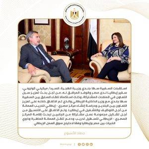 3) استقبلت السفيرة سها جندي وزيرة الهجرة، السيد/ ميكيلي كواروني، سفير إيطاليا لدى مصر والوفد المرافق له، من أجل بحث تعزيز سبل التعاون في الملفات المشتركة، وذلك استكمالا للقاء السابق بين السفيرة سها جندي مع وزير الداخلية الإيطالي والذي تم الاتفاق خلاله على تعزيز التعاون بين البلدين ودراسة إنشاء مركز مصري – إيطالي لتدريب العمالة من أجل التوظيف والتشغيل في إيطاليا. وتم الاتفاق على التنسيق من أجل تشكيل مجموعة عمل مشتركة من الجانبين لبحث إقامة المركز المصري – الإيطالي لتسهيل تدريب ودعم تنقل العمالة الماهرة وذوي الخبرات بين مصر وإيطاليا وفقا لاحتياج سوق العمل الإيطالي، على أن يقدم هذا المركز كافة الخدمات والتدريبات التي يحتاج إليها الشباب، وتأتي آليته عن طريق إقامة مقر فعلي للمركز وموقع إلكتروني ينظم ذلك وغيرها من السبل التي يمكن الاتفاق عليها لتنظيم العمالة وانتقالها، ليستفيد الجميع من هذه النتائج المرجوة.
