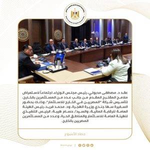 2) عقد د. مصطفى مدبولي، رئيس مجلس الوزراء، اجتماعاً لاستعراض ملامح المقترح المقدم من جانب عدد من المستثمرين بالخارج، لتأسيس شركة “المصريين في الخارج للاستثمار”، وذلك بحضور السفيرة سها جندي وزيرة الهجرة، ود. محمد فريد، رئيس الهيئة العامة للرقابة المالية، والسيد/ حسام هيبة، الرئيس التنفيذي للهيئة العامة للاستثمار والمناطق الحرة، وكل من م. أشرف دوس، رئيس مجلس إدارة شركة “فيرنبرو جلوبال” للاستثمار بالولايات المتحدة الأمريكية، وم. تامر هدايت، رئيس مجلس إدارة شركة “نت سينك” الأمريكية، ود. حسن الجراحي، رئيس مجلس إدارة شركة الأمل للطباعة بالمملكة العربية السعودية، والخبير المصرفي/ وائل حسن، مستشار التمويل العقاري السابق في بنك جي بي مورجان تشيس، والمستشار/ علاء رجب، المستشار القانوني بالبنك المركزي، والسيد/ عادل بولس، رئيس مجلس إدارة شركة “أميرة” للمنتجات الغذائية، والسيد/ كريم أسعد، الرئيس التنفيذي لشركة “بروكس آند كيمبتون”. وقد أوضحت الوزيرة أن فكرة إنشاء الشركة هي أحد المطالب والتوصيات الصادرة عن مؤتمر الكيانات المصرية بالخارج الذي عُقد في عام 2022، موضحة أنه تم اعتماد هذا المقترح والعمل عليه خلال الفترة الماضية، لافتة في هذا الصدد إلى ما تم عقده من اجتماعات ولقاءات مع عدد من الوزراء ومسئولي الجهات المعنية، تم خلالها بحث مجالات وفرص الاستثمار الواعدة في مصر، بالإضافة إلى الاجتماعات التي عقدت مع عدد كبير من المستثمرين المصريين بالخارج، بشأن استعراض فكرة إنشاء هذه الشركة.