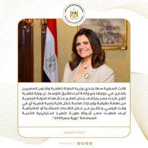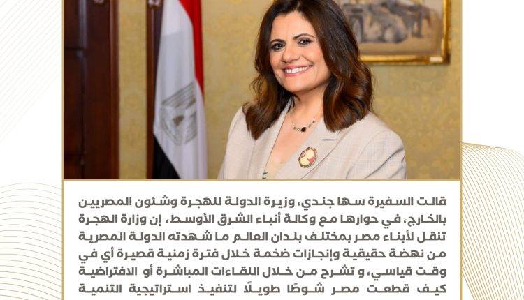 9) صرحت السفيرة سها جند وزيرة الهجرة، لوكالة أنباء الشرق الأوسط، بأن الوزارة تنقل لأبناء مصر بمختلف بلدان العالم ما شهدته الدولة المصرية من نهضة حقيقية وإنجازات ضخمة خلال فترة زمنية قصيرة أي في وقت قياسي، و تشرح من خلال اللقاءات المباشرة أو الافتراضية كيف قطعت مصر شوطًا طويلًا لتنفيذ استراتيجية التنمية المستدامة “رؤية مصر2030”.