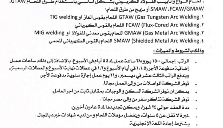 أعلن محمد جبران وزير العمل ،اليوم الثلاثاء، عن توفير 6 فرص عمل في شركة Multimarine Services Ltd ، القبرصية، وذلك على مهنة “فني لحام” بالتخصصات الأتية : لحام ألواح وأنابيب الفولاذ الكربوني بشكل أساسي باستخدام طرق اللحام GTAW ،أو مزيج من طرق اللحام Smaw fsaw/Gmaw ؛ واللحام بقوس الغاز ، واللحام بالقوس الكهربائي ،واللحام بالقوس المعدني للفولاذ ،واللحام بالقوس الكهربائي المحمي.