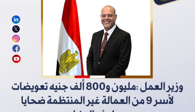 وافق محمد جبران وزير العمل ؛ اليوم الثلاثاء؛ علي صرف مليون و800 ألف جنيه تعويضات من بند الحوادث بالحساب المركزي للرعاية الصحية والاجتماعية للعمالة غير المنتظمة، لصالح أسر 9 عمال ضحايا حادث، كان قد وقع بالطريق الدائري بمركز سمالوط بالمنيا.