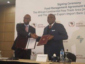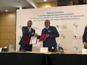 وقع على الاتفاق البروفيسور بنديكت أوراما، رئيس مجلس إدارة البنك الأفريقي للاستيراد والتصدير وسعادة وامكيلي ميني، الأمين العام لأمانة منطقة التجارة الحرة القارية الأفريقية.