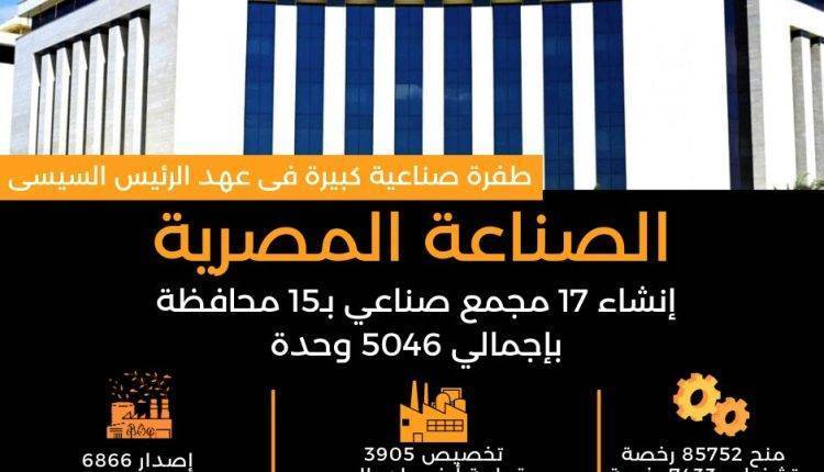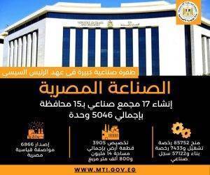 الرئيس السيسى و9 سنوات من الانجازات فى قطاع الصناعة إنشاء 17 مجمع صناعي بـ15 محافظة بإجمالي 5046 وحدة