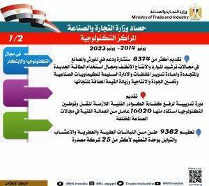 – تنفيذ أكثر من 50 مشروع لدعم الصناعة الوطنية في مجالات نقل التكنولوجيا الصديقة للبيئية وادارة المخلفات الصناعية وتقديم الحلول البيئية المبتكرة ونقل وتسويق التكنولوجيا حيث بلغ عدد الشركات المستفيدة من خدمات المراكز التكنولوجية 19860 في عديد من القطاعات الصناعية المختلفة.
