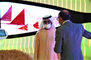 شهد الجناح المصري المشارك بإكسبو 2020 دبي زيارة من صاحب السمو الشيخ/ محمد بن راشد آل مكتوم، نائب رئيس دولة الإمارات رئيس مجلس الوزراء حاكم دبي برفقة عدد من رموز وقيادات دولة الامارات وكان في استقباله الدكتور/ أحمد مغاوري رئيس التمثيل التجاري والمفوض العام للجناح المصري بإكسبو 2020 دبي.
