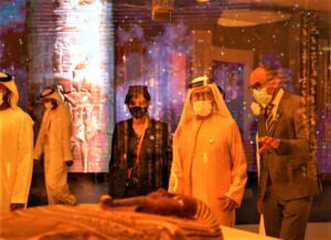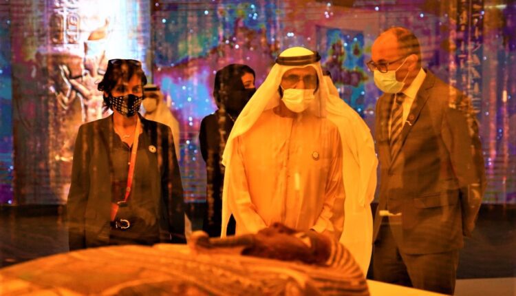 وقد اطلع سمو الشيخ على محتويات الجناح والتى تشمل اقسام الطاقة والزراعة والصناعة والمشروعات المصرية والمبادرات التنموية العملاقة والتابوت الأثري للكاهن بسماتيك . كما استمع سموه الى شرح عن التابوت وكيف يساهم وجوده في استكمال الفكرة التي يتم استعراضها في مجمل محتوى الجناح والتي يعبر عنها شعار مصر في اكسبو ٢٠٢٠ دبي وهو “مصر: عراقة تعزز المستقبل”.