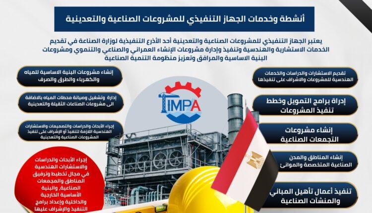 يعتبر الجهاز التنفيذي للمشروعات الصناعية والتعدينية أحد الأذرع التنفيذية لوزارة الصناعة في تقديم الخدمات الاستشارية والهندسية وتنفيذ وإدارة مشروعات الإنشاء العمراني والصناعي والتنموي ومشروعات البنية الاساسية والمرافق، وتعزيز منظومة التنمية الصناعية.