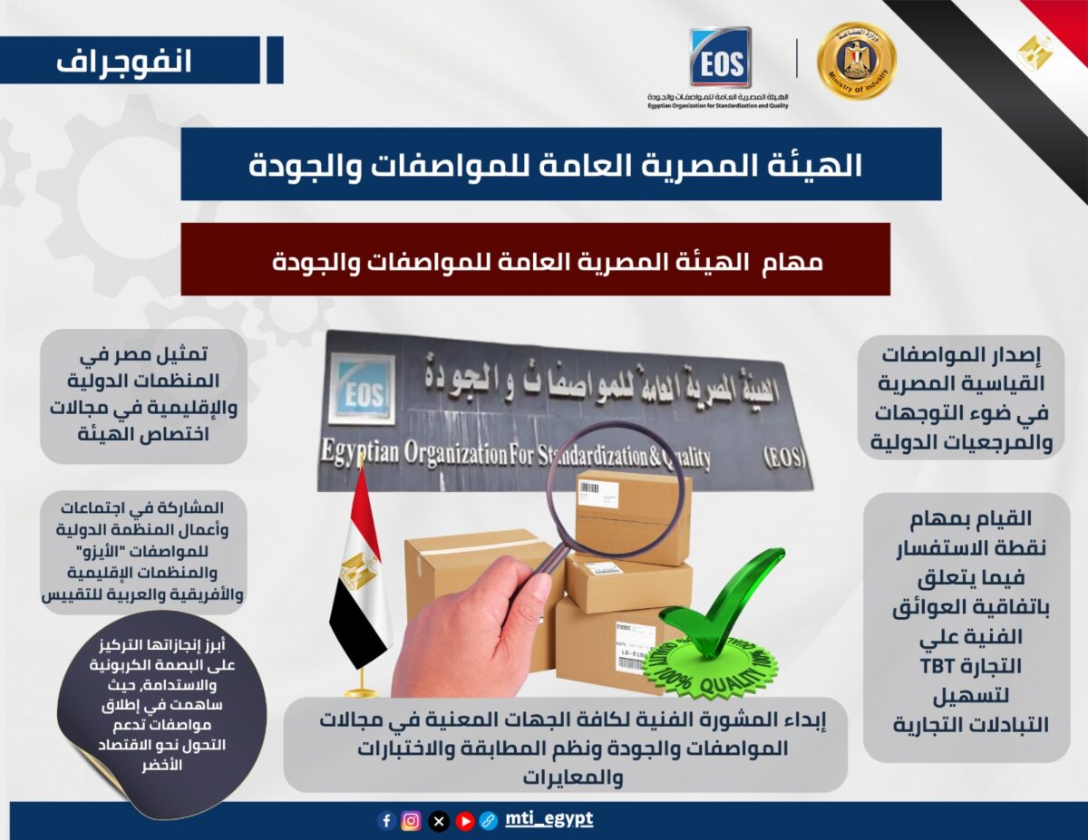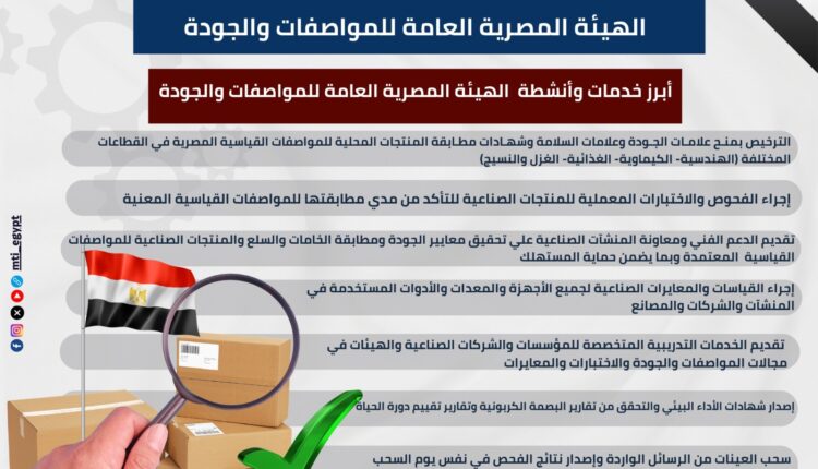 تعرف على خدمات وأنشطة الهيئة العامة للمواصفات والجودة ودورها في دعم وتحديث الصناعة المصرية من خلال إصدار المواصفات القياسية المصرية وفقًا للمواصفات القياسية الدولية مما يعزز تنافسية المنتجات المصرية عالميًا