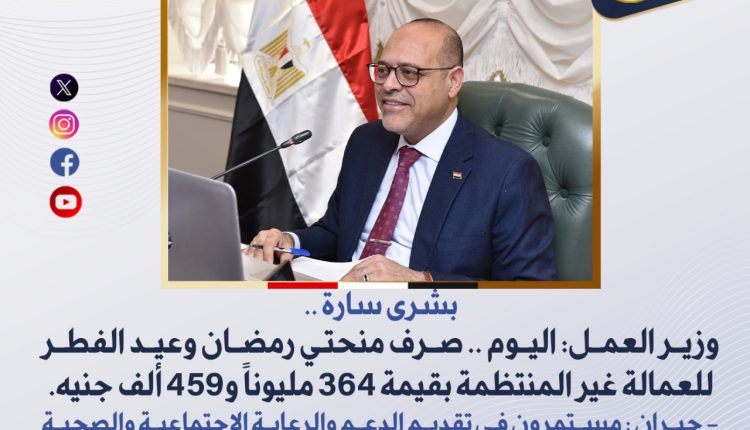 أعتمد محمد جبران وزير العمل، اليوم الخميس؛ صرف منحتي شهر رمضان،وعيد الفطر، للعام 2025 ميلادية / 1446 هجرية، للعمالة غير المنتظمة المسجلة لدى قاعدة بيانات الوزارة عن طريق المقاولين والشركات ، وذلك بإجمالي 364 مليوناً و459 ألف جنيه،من الحساب المركزي للرعاية الصحية والاجتماعية للعمالة غير المنتظمة التابع للوزارة . وأوضح الوزير أن عملية الصرف ستتم بعد ظهر اليوم من خلال مكاتب ومنافذ هيئة البريد ببطاقة الرقم القومي ، للمسجلين فقط ،لدى قاعدة بيانات الوزارة.. وأكد الوزير أن دعم وحماية العمالة غير المنتظمة مستمر بتوجيهات من الرئيس عبدالفتاح السيسي ، موضحا أنه بجانب الدعم المادي بالمنح الدورية، والتعويضات في حال الوفاة أو الإصابة ، تتعاون الوزارة مع الوزارات والجهات المعنية بتكثيف الجهود للاستمرار في مد مظلة الحماية الصحية للعمالة غير المنتظمة باعتبارها من الفئات الأولى بالرعاية التي توليها الحكومة الاهتمام .