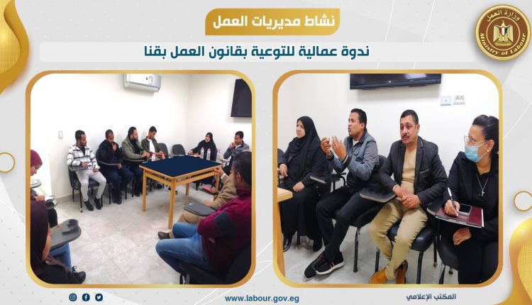 نظم مكتب تفتيش عمل قنا ندوة عمالية بمستشفى رويال، تناولت أهم مواد قانون العمل رقم 12 لسنة 2003، ومنها الحد الأدنى للأجور، الإجازات ولائحة تشغيل النساء، وذلك في إطار توجيهات وزير العمل محمد جبران، بتكثيف الفعاليات التي تعمل على تعزيز الوعي بالقوانين العمالية.