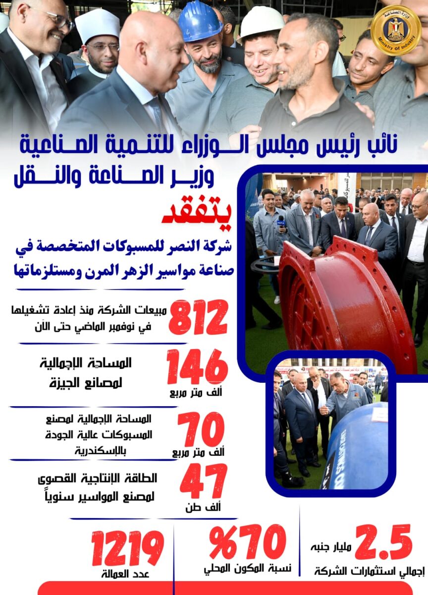 وقد اطلع الوزير خلال جولته على المؤشرات المالية والإنتاجية للشركة، حيث بلغت مبيعاتها منذ إعادة تشغيلها في نوفمبر الماضي نحو 812 مليون جنيه، وهو ما يعكس عودة قوية للشركة على خريطة الصناعة الوطنية وتعزيز قدرتها التنافسية في السوقين المحلي والإقليمي، كما استمع إلى شرح تفصيلي حول إمكانيات الشركة، حيث تبلغ المساحة الإجمالية لمصانع الجيزة 146 ألف متر مربع ومصنع المسبوكات عالية الجودة بالإسكندرية 70 ألف متر، فيما تصل الطاقة الإنتاجية القصوى لمصنع المواسير إلى 47 ألف طن سنوياً بنسبة مكون محلي تصل إلى 70%، ويقدر إجمالي استثمارات الشركة بحوالي 2.5 مليار جنيه، وعدد العمالة 1219 عاملاً وهو ما يؤكد أهمية الشركة كصرح صناعي استراتيجي يساهم في تلبية احتياجات مشروعات البنية التحتية القومية من منتجات الزهر المرن عالية الجودة.