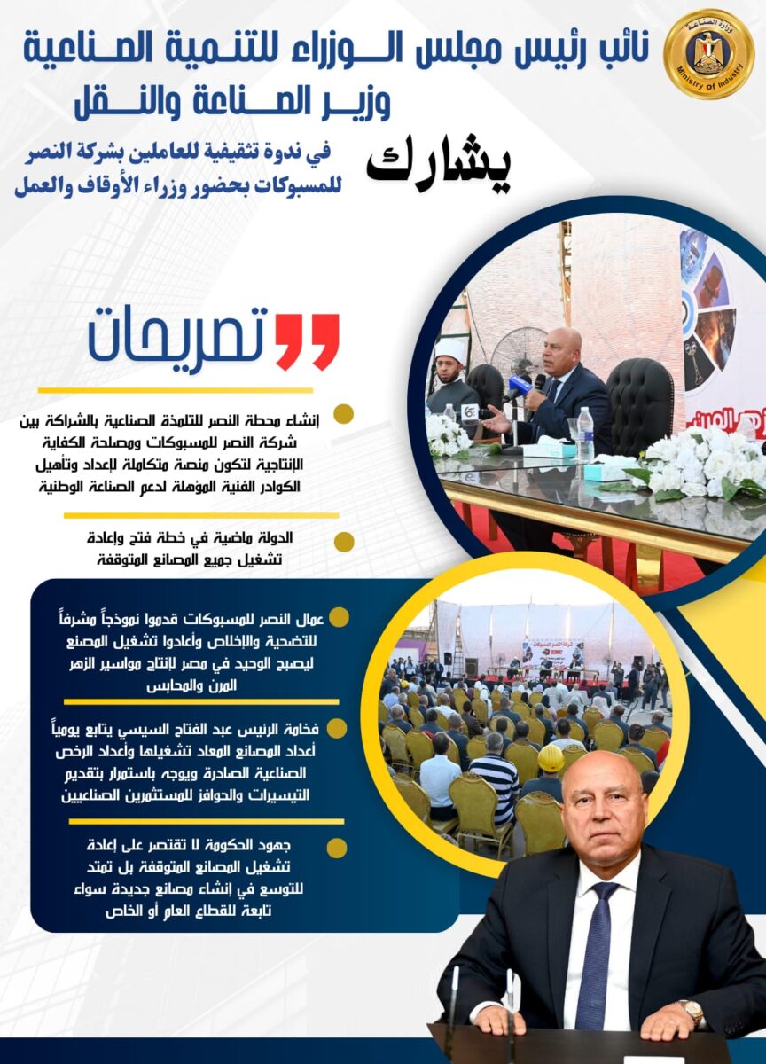 وفي تصريحات صحفية عقب الندوة التثقيفية، نقل نائب رئيس مجلس الوزراء للتنمية الصناعية ووزير الصناعة والنقل رسالة فخامة الرئيس عبد الفتاح السيسي، والتي شدد فيها على ضرورة تكثيف العمل ومضاعفة الإنتاج، مستشهداً بمقولته: “هنفضل نشتغل لحد ما نخليها بلد”. كما أكد الوزير أن فخامة الرئيس عبد الفتاح السيسي يتابع يومياً أعداد المصانع التي أعيد تشغيلها وأعداد الرخص الصناعية الصادرة، ويوجّه باستمرار بتقديم كل التيسيرات والحوافز للمستثمرين الصناعيين، دعماً لزيادة الاستثمارات وتعزيز قدرات الصناعة المحلية.