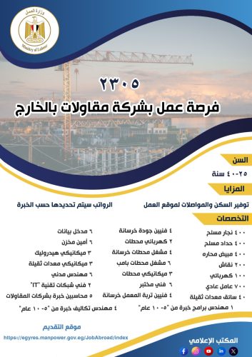 وقالت : إن الوظائف المطلوبة هي: 400 نجار مسلح ، و400 حداد مسلح، و400 مبيض محاره، و200 نقاش، و100 كهربائي، و700 عامل عادي، و40 سائق معدات ثقيلة “تركتر – حفار – نساف – تريلا”، و4 فنيين جودة خرسانة، و2 كهربائي محطات، و4 مشغل محطات خرسانة، و6 مشغل محطات بامب، و3 ميكانيكي محطات، و 6 فني مختبر ، و4 فنيين تربة المعمل خرسانة، و1 مهندس برامج خبرة من 5 إلي 10 سنوات، و 3 ميكانيكي معدات ثقيلة،و6 مهندس مدني،و 4 مهندس تكاليف خبرة من من 5 إلي 10 سنوات، و 5 محاسبين خبرة بشركات المقاولات، 2 فني شبكات تقنية “IT”،و 6 مدخل بيانات ، و6 أمين مخزن،و 3 ميكانيكي هيدروليك.