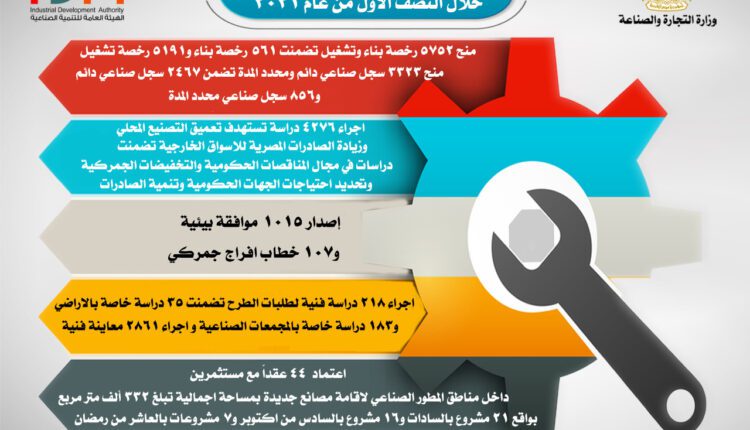 وفى هذا الإطار أوضح اللواء / محمد الزلاط رئيس الهيئة العامة للتنمية الصناعية أن المؤشرات الإيجابية التى حققتها الهيئة خلال الـ6 اشهر الأولى من العام الجارى تأتى تتويجاً للجهود الكبيرة التى تقوم بها الهيئة لخدمة القطاع الصناعى فى إطار الخطة الشاملة لوزارة التجارة والصناعة الهادفة إلى الإرتقاء بالقدرة التنافسية للصناعة المصرية وإستعادة مكانتها على خريطة الصناعة العالمية خاصة فى ظل الإمكانات الصناعية الكبيرة التى تتمتع بها مصر