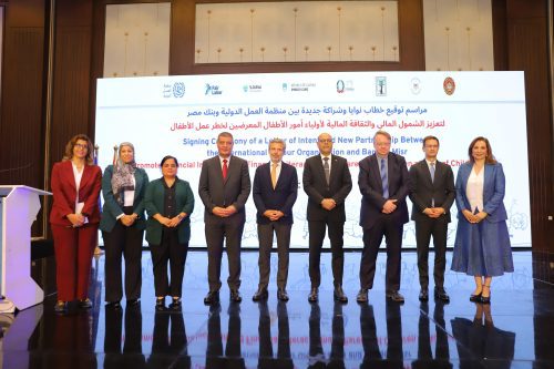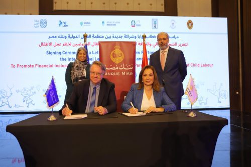في اطار خطة بنك مصر لدعم جهود الدولة لتعزيز الشمول المالي والقضاء على عمل الأطفال، قام البنك مؤخرا بتوقيع بروتوكول تعاون مع منظمة العمل الدولية ، وذلك ضمن إطار مشروعات المنظمة لمكافحة عمل الأطفال،حيث قامت الأستاذة /هند فهمى – رئيس قطاع الشمول المالي والتمويل العقاري ببنك مصر بتوقيع بروتوكول التعاون مع الأستاذ/ إيريك أوشلان- مدير مكتب منظمة العمل الدولية بمصر، وقد حضر التوقيع لفيف متميز من قيادات بنك مصر ومنظمة العمل الدولية وممثلي السفارة الإيطالية و سفارة سلوفينيا بجمهورية مصر العربية.