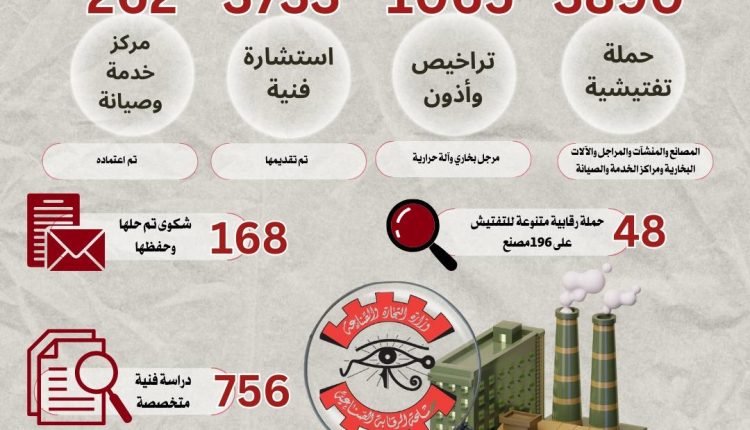 كشف أحدث تقرير تلقاه المهندس/ أحمد سمير وزير التجارة والصناعة حول مؤشرات أداء مصلحة الرقابة الصناعية خلال الفترة من شهر يناير وحتى شهر مارس 2024 أن المصلحة قامت بإجراء 3890 حملة تفتيشية على المصانع والمنشآت والمراجل والآلات البخارية ومراكز الخدمة والصيانة، وإجراء 756دراسة فنية متخصصة تضمنت 723 دراسة فنية في مجال السماح المؤقت والدروباك، و12 دراسة فنية لهيئة الاستثمار والمناطق الحرة، و17 دراسة فنية لمصلحة الضرائب و4 دراسة لاستخدام حصص الكحول.