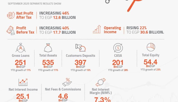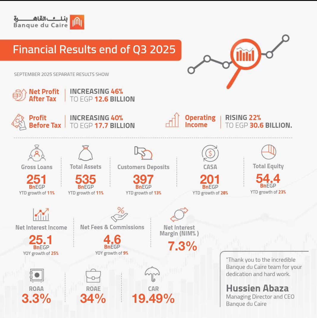حقق بنك القاهرة أداءاً إيجابيًا خلال التسعة أشهر الأولى من عام 2025، محققاً نموًا في صافي أرباحه بنسبة 46% مقارنة بنفس الفترة من العام الماضي.